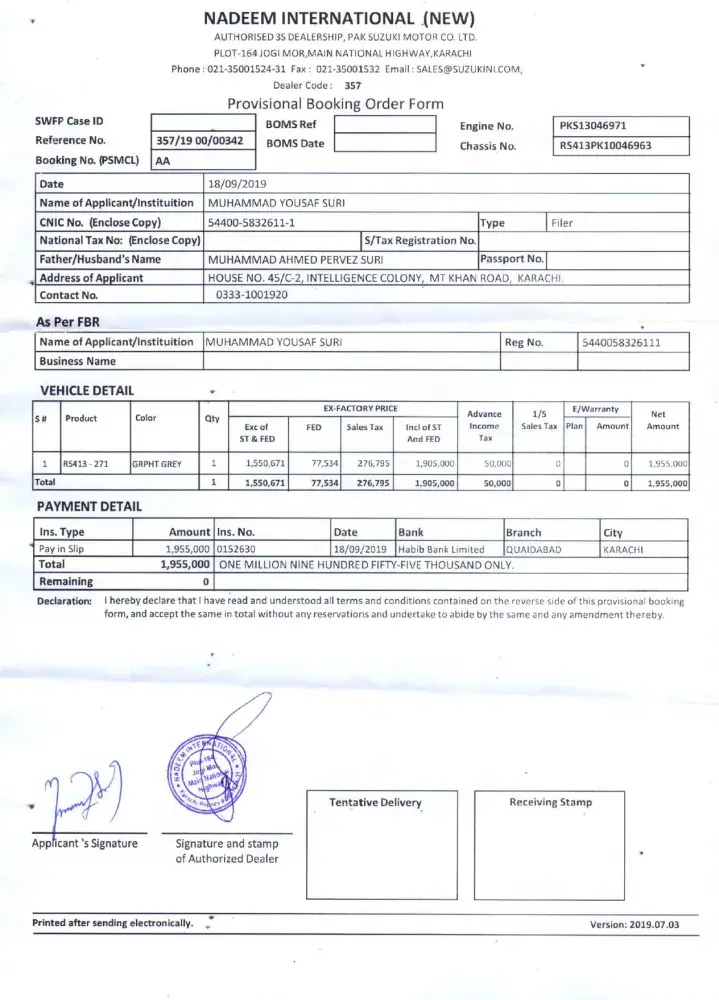 The concerned Suzuki personnel Mr. Zohaib had collected the Pay order without provision of booking order receipt. The undersigned had shown concern on it but the said officer of Pak Suzuki has given some technical excuse and provided receiving on the photocopy of the PO (Attached as Annex-A) and ensured to send the booking receipt by next day. On the next day, the concerned officer has told me that the booking receipt will be shared by the assigned dealership which would be communicated when assigned. After continuous follow-ups the undersigned has received the provisional booking receipt from the dealer named Suzuki Nadeem International (Not from booking Office) referred by Suzuki booking officer. In provisional booking receipt, Booking number was missing with wrong contact number which was reported to concerned dealership officer Ms. Kousar at "Suzuki Nadeem International" who told that the booked car has been assigned the Chassis No. and Engine No. due to which the booking number was not shown. The same has been communicated to Suzuki booking office official Mr. Zohaib for verification which was verified by him.