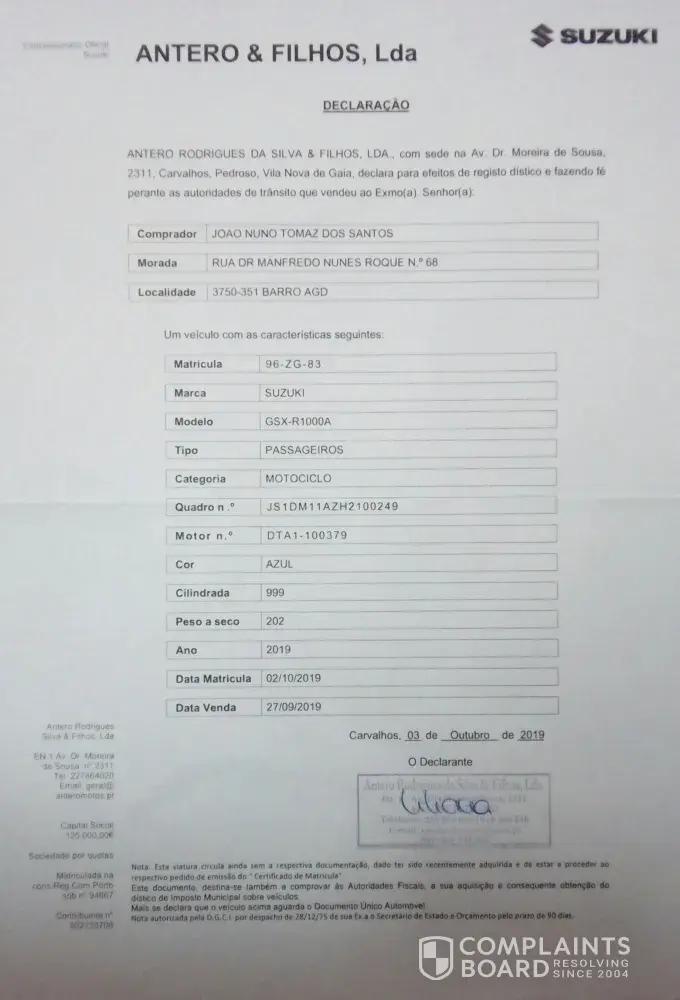 I bought one suzuki gsxr 1000a new in Portugal in 2019/10/03 and the store delivery to me a motorcycle produced in the beginning of 2017 without saying anything about it. When I realized this fact they told me that this was the only model that was available at the import representant. The motorcycle is out of market and even so nobody told me that I was buying a motorcycle produced in the beginning of 2017. I don't understand how this is possible. Is this the new company politics? Meantime I detected some defects on the motorcycle, probably because the motorcycle was stored all this time and somebody cleaned improperly leaving shallow scratches on the display screen and windscreen. I also detected others defected parts. I´m very angry about this situacion.