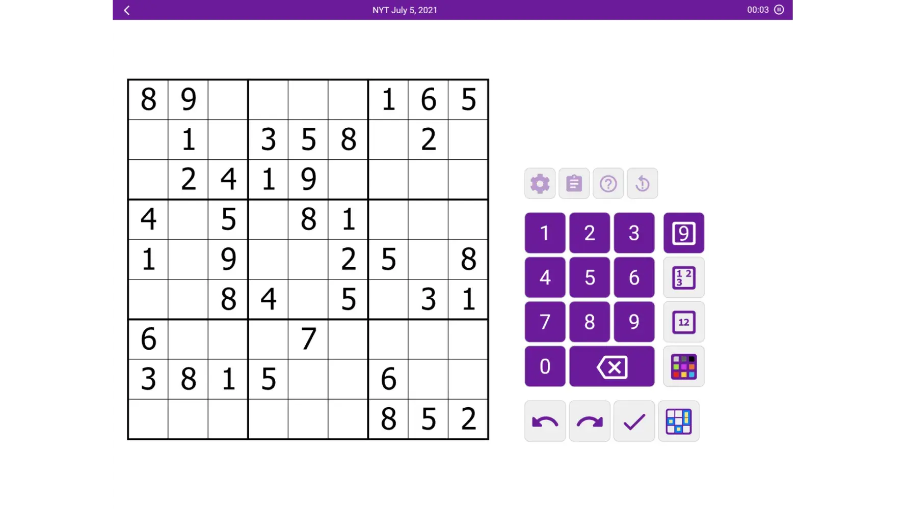 Double-tapping a filled cell highlights all cells of that number. This is helpful, but it would be great if selecting a digit in the number pad did this. Maybe each “version" of the number pad (number, corner marks, and center marks) could highlight all candidates of that type.