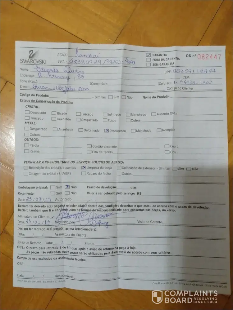 In april 11th, 2018, I gave a beautiful Swarovski ring (attract ring model) as a 15 year old gift to my daughter. After almost 1 year, inside the guarantee period, I took the Swarovsi store (in Brazil - Jundiaà Shopping's store) to make a repair, because the ring was peeled off. I left the ring in Swarovski store on February 23, 2019 for this repair. Today, July 22, 2019, I received the news that the repair request was canceled. They said I could trade for another piece, but that doesn't interest us, after all the ring has a much higher sentimental value than the financial one. I'm very disapointed with Swarovski customer service in Brazil. Too much time (5 months) just to say "sorry, we can't help you". This kind of things make us to reflex about how much really worth this brand. So, I holpe, with these comments, to help Swarovski to become a better company. Goodbye