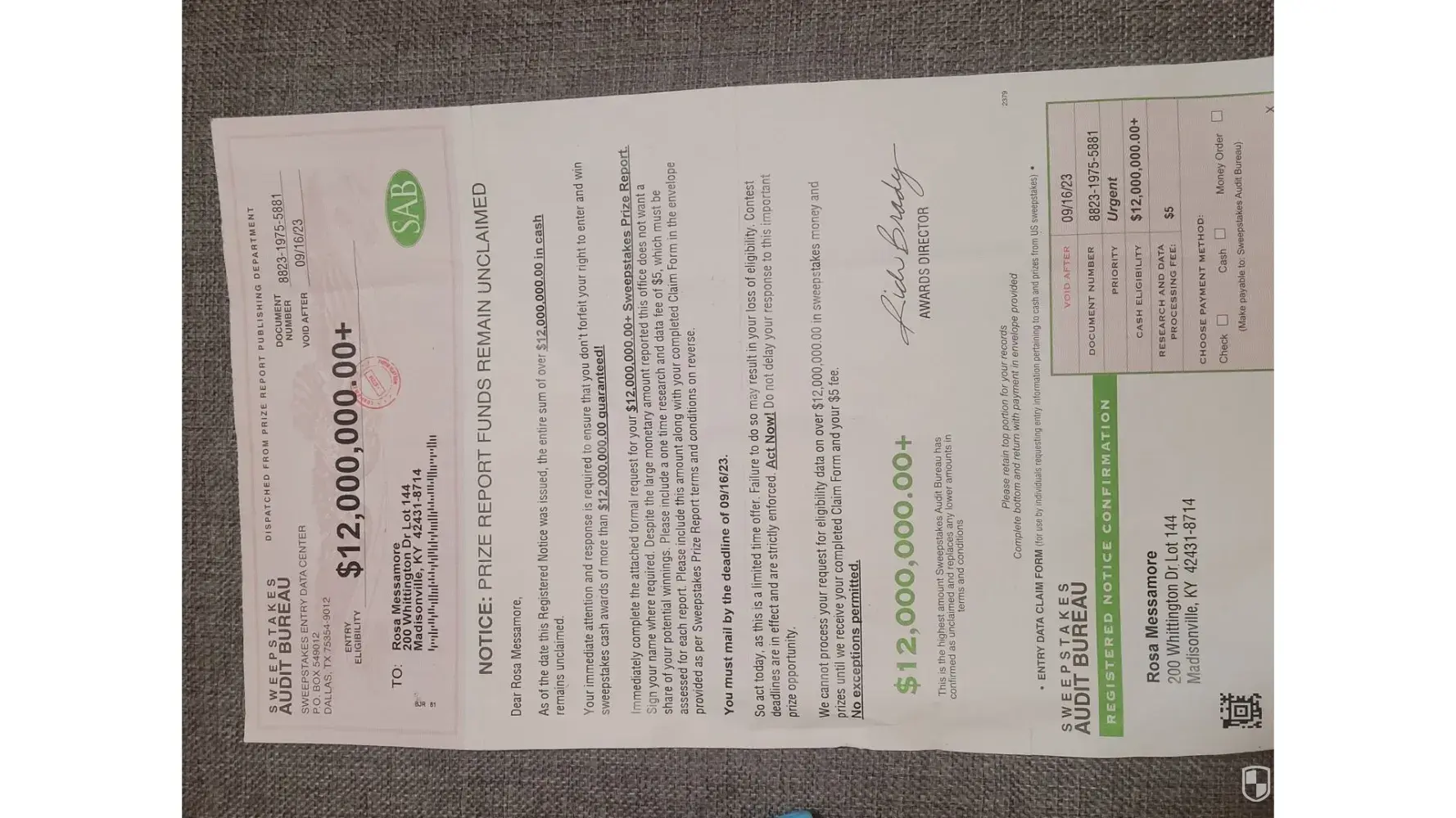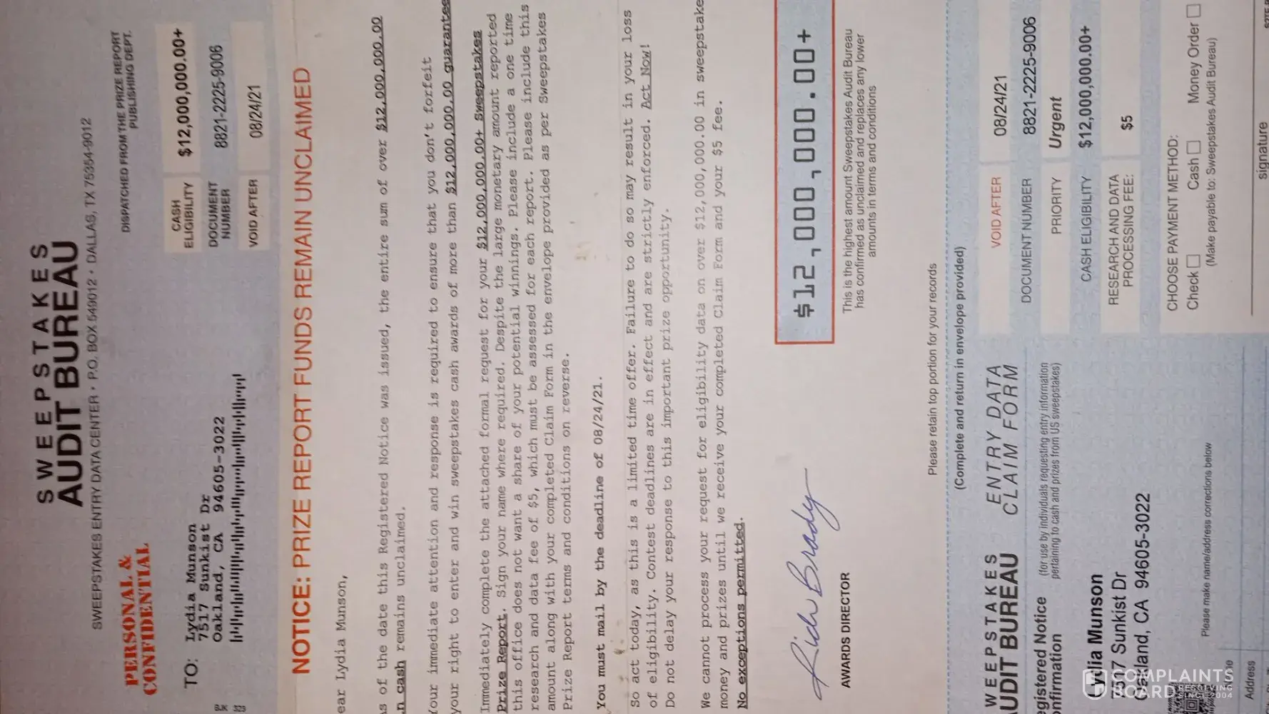 I I was going through my mail. Well I was actually cleaning off my desk and I came across a sweepstakes audit bureau that I received in 2021. It was a notice prize report funds remain unclaimed. I had showed it to my dad I showed it to few of my friends and they all told me it was not real that it was just a scam. Before I Chuck it in the garbage I thought I would make a complaint and hope that it won't happen to anyone else because getting your hopes up for an amount is significant as 12 million well needless to say it's enough to give somebody a heart attack. Anyway I will take a picture of it so you can see it and that concludes my complaint. Truly Lydia Munson