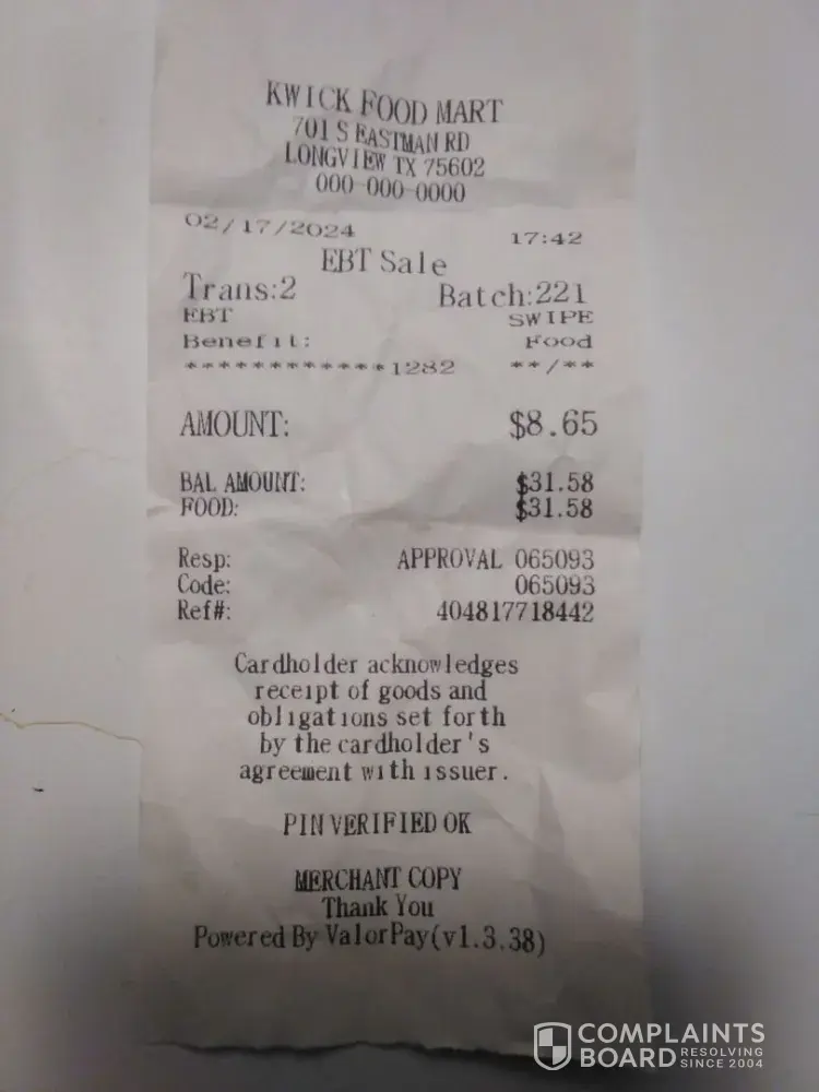 Carolyn Moore 1501 East Young St Apt 86 Longview Texas 75602 I was just attacked at Kwick Food Mart at Eastman Road. I only purchased $8.65 and my cellphone was removed by a black female that was darker completion than I am who talked to an sweepstakes agent took a picture and ordered my money off of my below Visa Debit card of information I gave below. She even ordered to remove my cellphone number although she took her picture on my snatched cellphone had a male return it. Place everything back as I gave it below. It's not her money. I took a photo of the only transaction I made in the store. I didn't give $4,000.nor money to buy a store