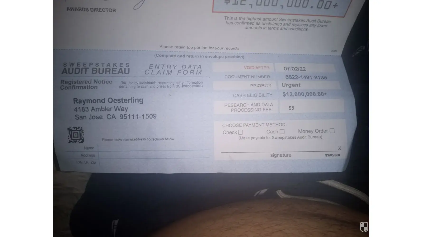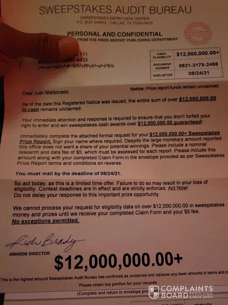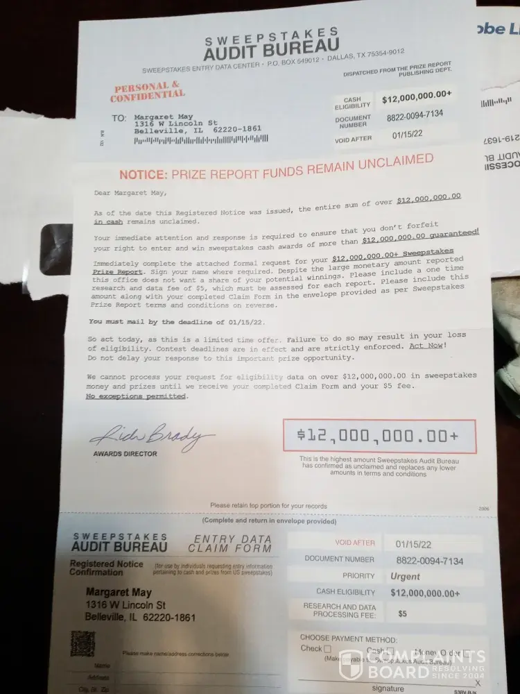The Company is asking me to pay $5 to process my winnings of $12,000,000.00+ guaranteed. At the top of the letter addressed to me looks like a check written to me and in that area it states Personal and confidential. The letter from the awards Director Rich Brady, Sweepstakes Entry Data Center, P.O. Box 54912, Dallas, TX 75354. NOTICE: prize report funds remain unclaimed, Document # [protected]. Void After 3/19/22. Priority: Urgent. On the back of the letter it has Sweepstakes prize report terms and conditions.
