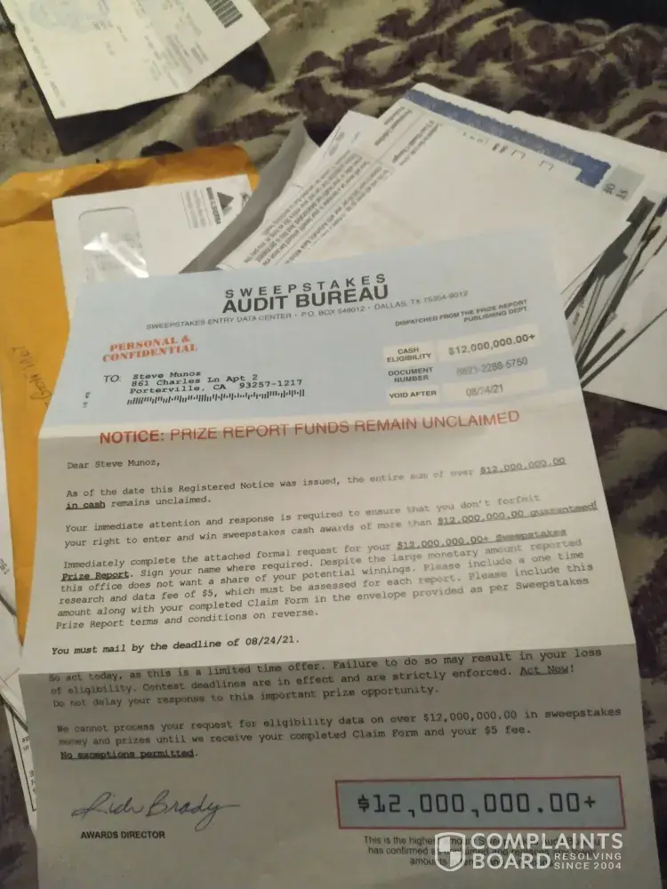 I just received the "exact" same letter.. The Sweepstakes Audit Bureau " in Dallas Texas. They apparently aren't very worried by any wrong they are doing cause my letter reads identical to the ones I see here. I decided to research this company before getting my hopes up. I see I was right. The only thing different on my letter is the document number [protected] VOID after date 04/02/22. Everything else is the same signed by Rich Brady. I suppose he isn't real.