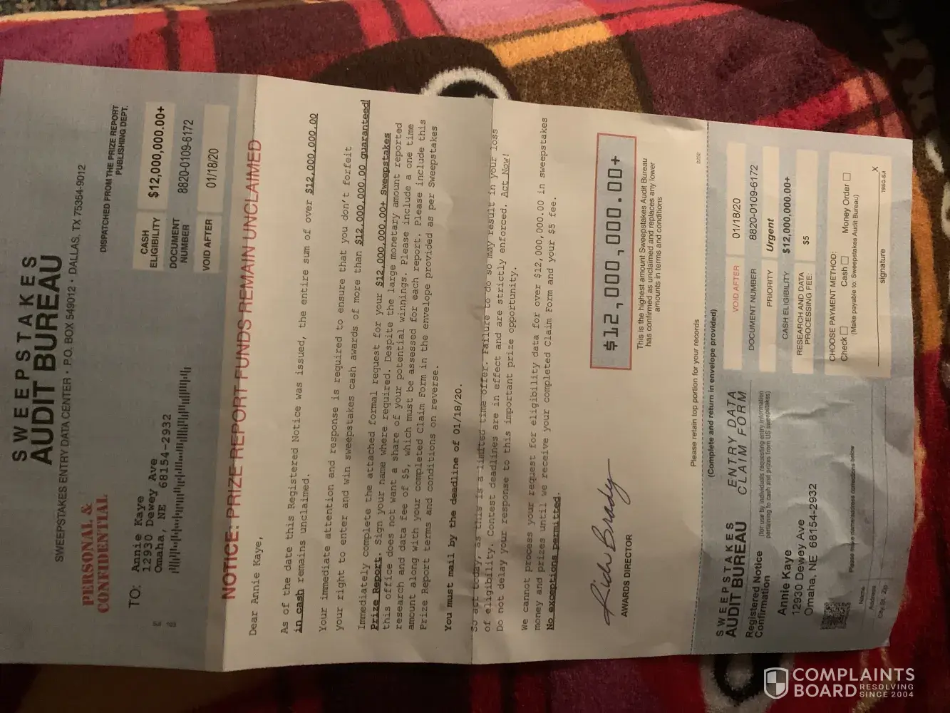 Received letter in the mail today, November 2nd, 2020, asking me to send them $5.00 in a check, cash, money order. Make payable to: sweepstakes audit Bureau. The five (5) dollars li for " research and data processing fee. If I don't send the money, then my entry data claim form for the $12 million dollars can't not be processed making me ineligible to win.