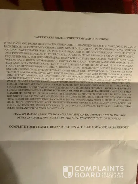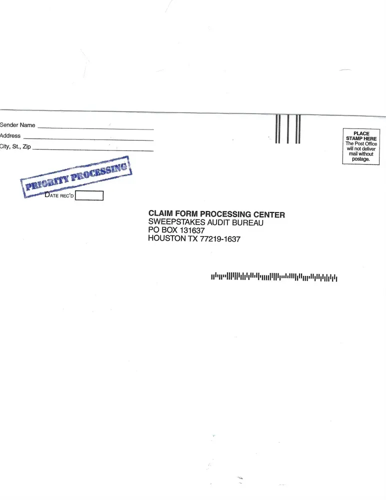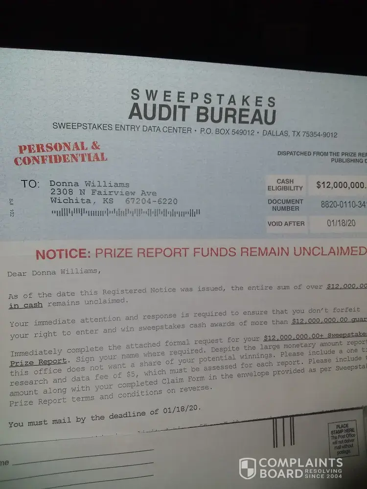 Sweepstakes Audit Bureau addressPO Box 549012, Dallas, Texas, 75354-9012, United States