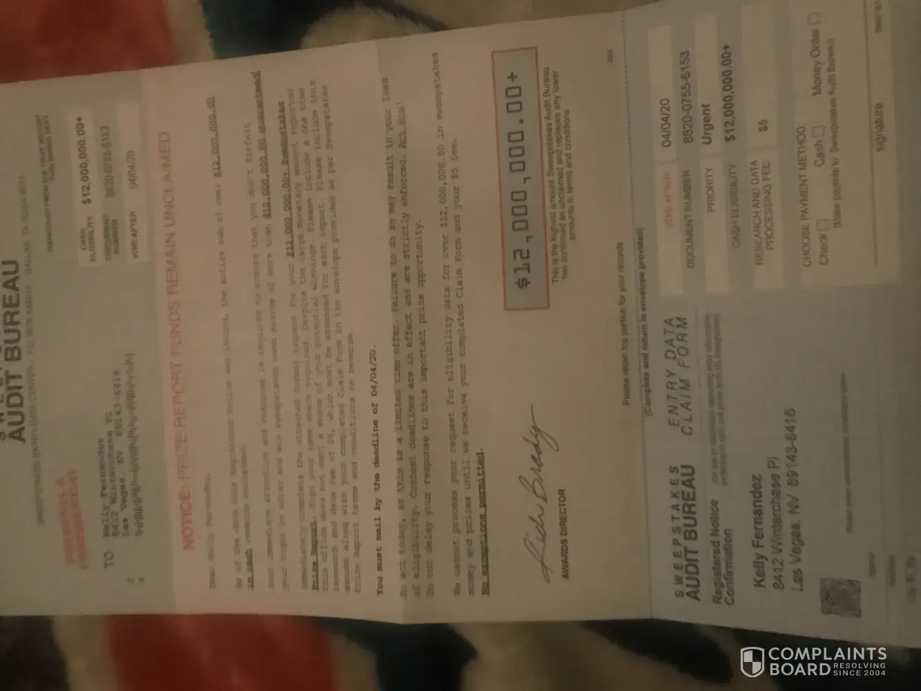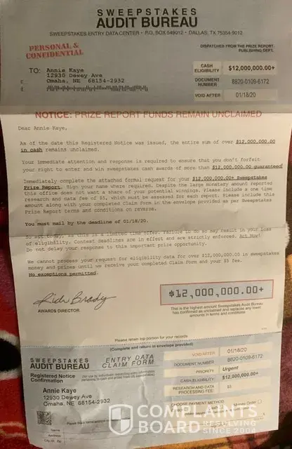 I received 2 letters today from this fraudulent company telling me to send them $5.00 for my entry into their sweepstakes to win $12,000, 000.00 and the other letter also told me to send them $5.00 so I could claim my Prize Claim of $10,000.00.