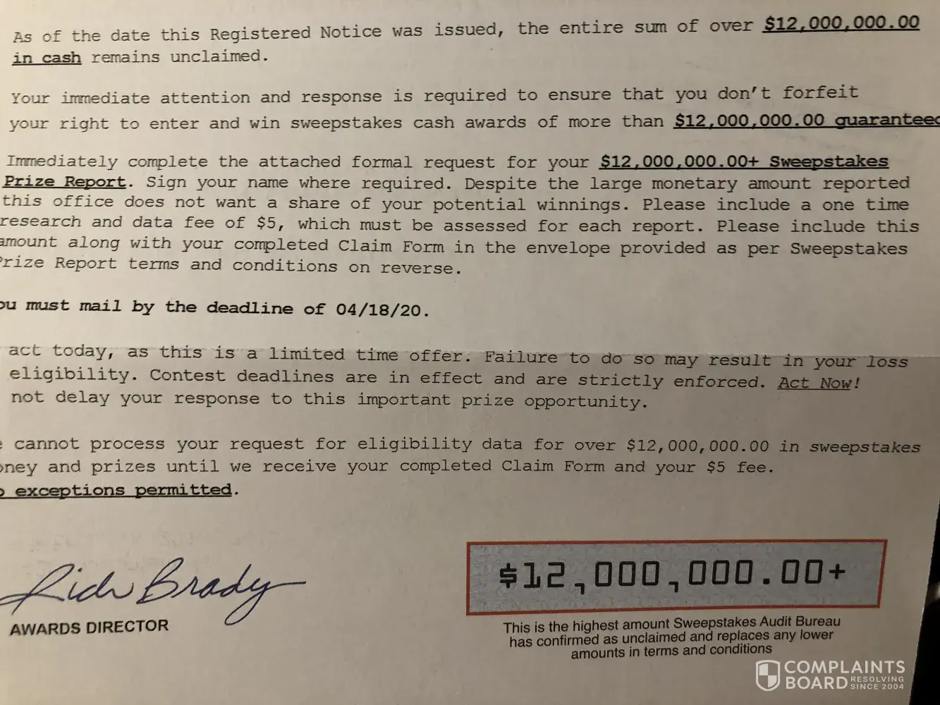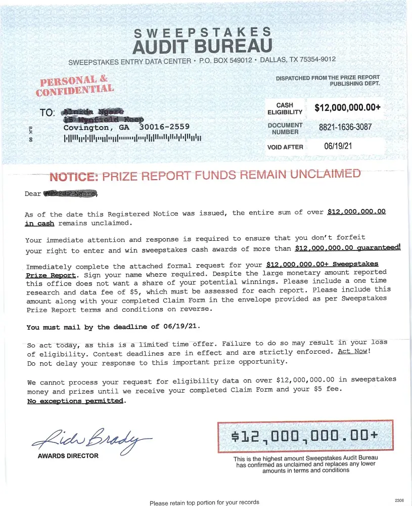 I received a letter requesting $5.00 to be eligible to receiver over 12, 000, 000.00 if I send them the money by 06/19/21. After reading everyone's complaint, they will not be getting my $5.00.