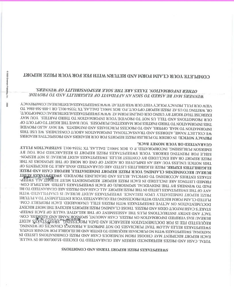I did a little research on the above named company after receiving in the mail what appeared to be a guarantee of some kind of Sweepstakes winnings or something to that effect. If I return by the deadline and include a minimal fee of $5. It appears this is a scam and I'm just letting whomever know they are still in operations. Personally this is the first time I've won and that's only because I did not send the $5!