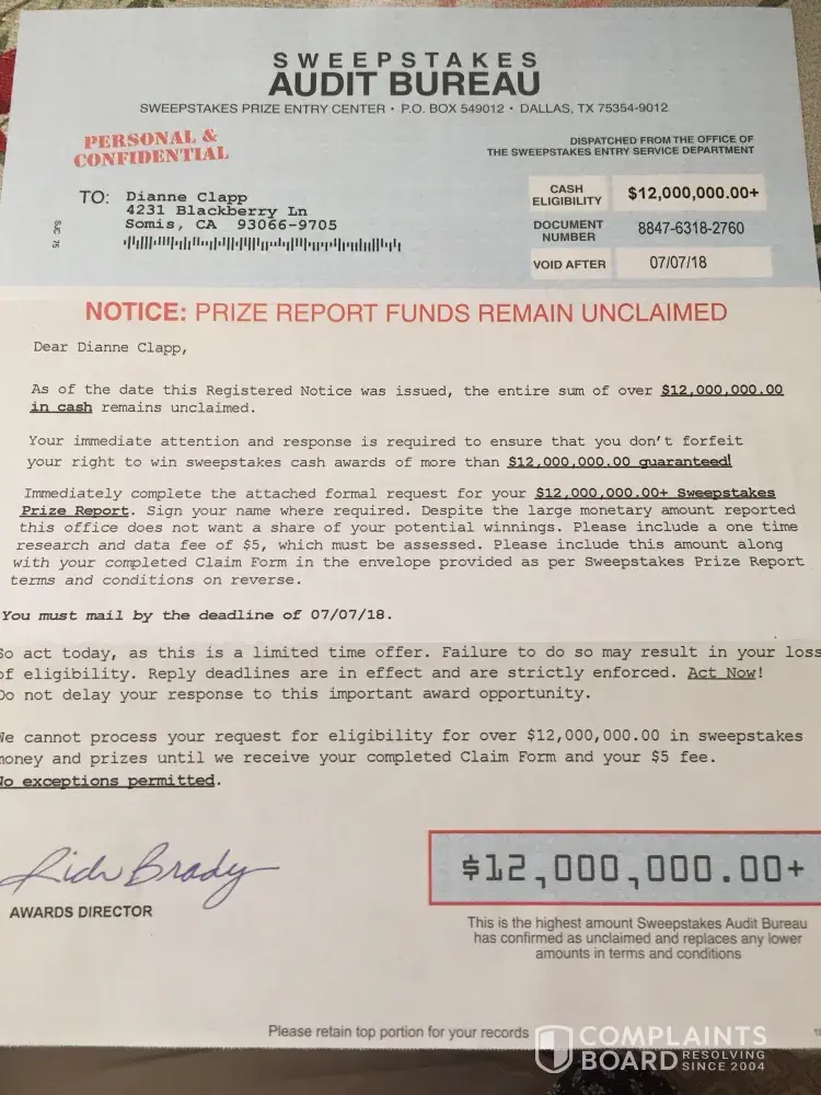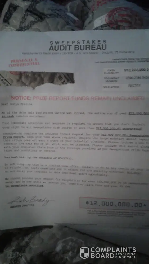 have received many of these so called sweepstakes advisory notifications claiming there is 12, 000, 000.00 dollars of unclaimed prize money and to send $5.00 or i'll forfeit my rights to win this sweepstakes cash award . These people flood your mail boxes with this "SCAM" at least 2 or 3 times a week and someone must stop these people. To me it is a form of...