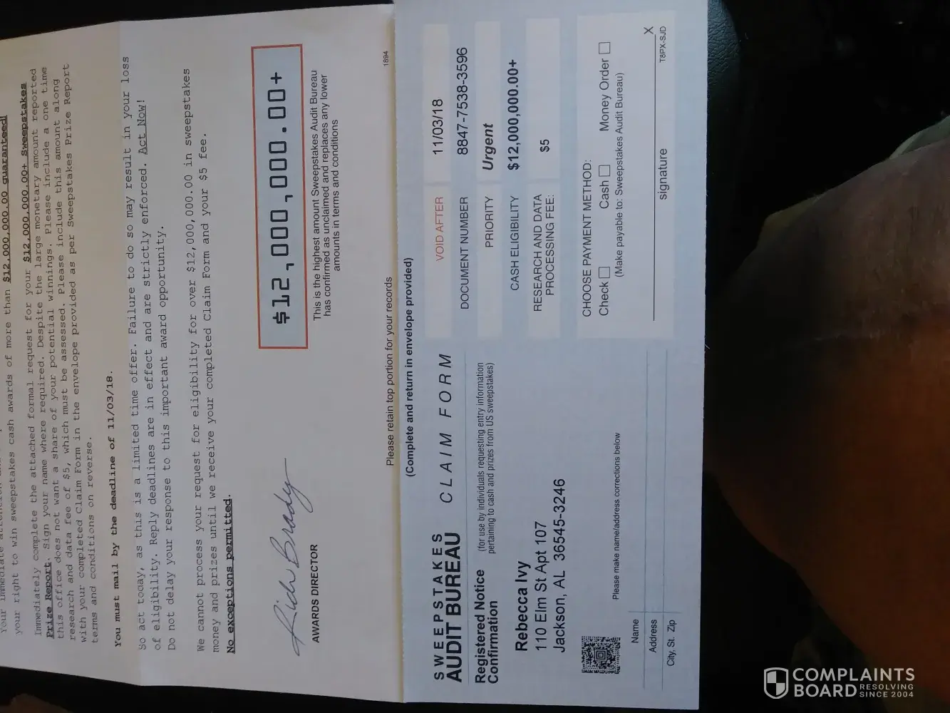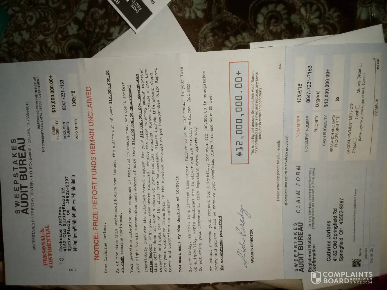 We cannot process your request for eligibility for over 12, 000, 000.00 in sweepstakes money and prizes until we receive your completed claim form and your $5 fee. No exceptions permitted. Signed. Rich Brady Awards Director. Claim form attached with return envelope.stam to be placed on it.