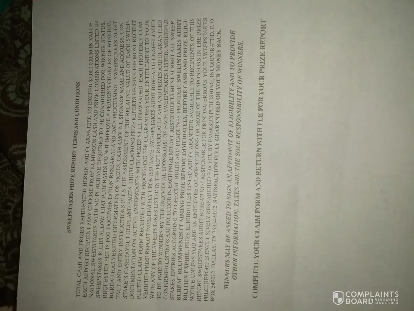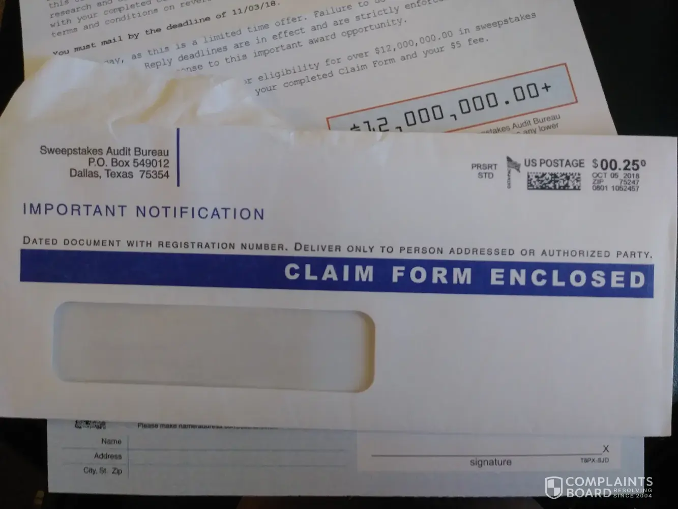 Sweepstakes Audit Bureau addressPO Box 549012, Dallas, Texas, 75354-9012, United States