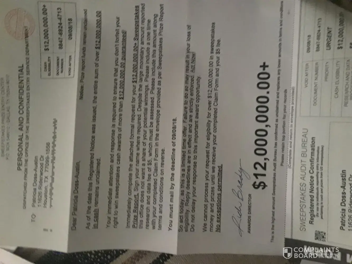 In the last year, I have received several letters from a rich, L., And other names, but all with the last name of Brady.. Each of these letters say I'm eligible to claim 12, 000, 000.00 if I send $5 for processing fees. The claim number assigned is document # [protected] due by 5/27/2017. They claim they don't want to take anything away from your rewards, but need a processing fee cover the costs of making you edible for this, or larger amounts outlined in their policy, and strict edibility response dates. Would love for this company located p.o. box 549012, Dallas, TX 75354. Please ignore any request via email, and via mail from this company, because it's a scam.