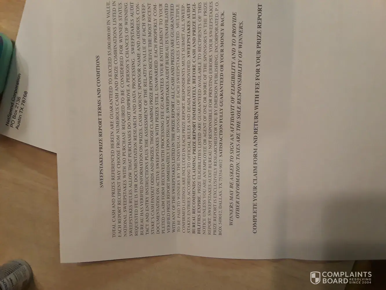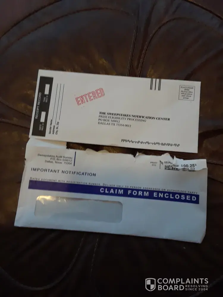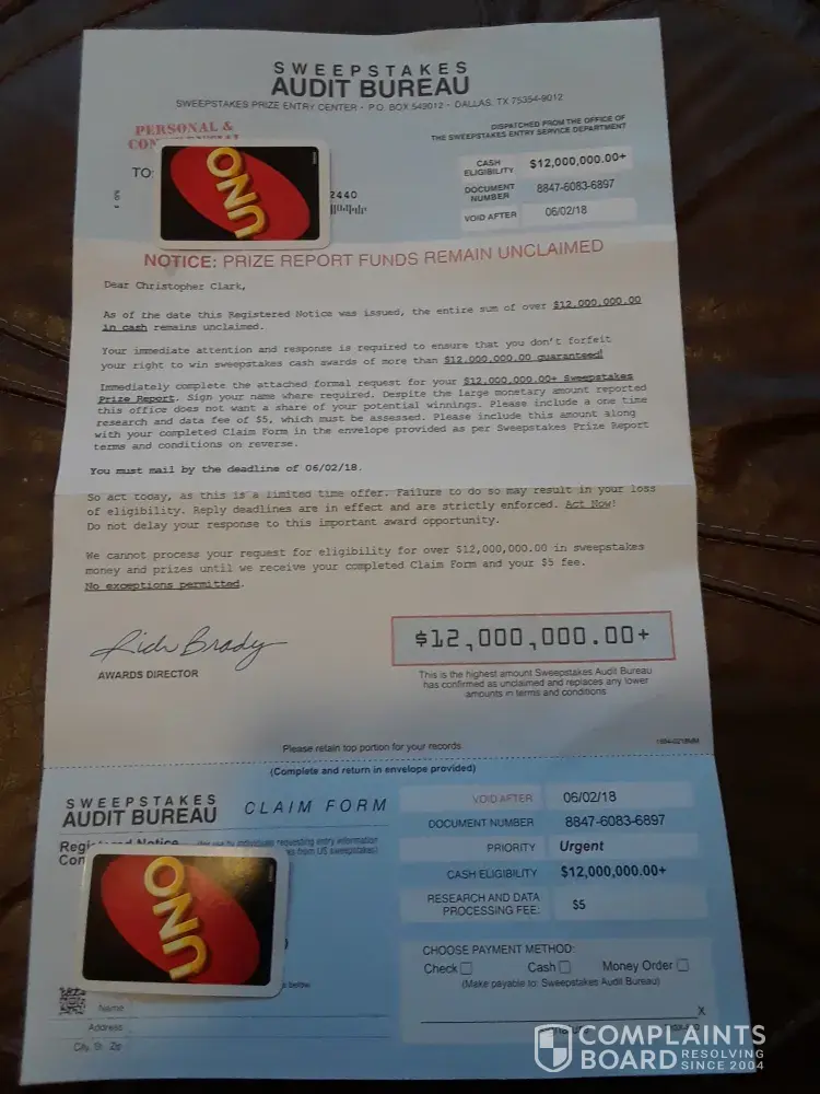 I ALSO RECD second NOTICE REQ ANOTHER $5.00 THEN CAME TO THIS PAGE. they don't check to they sent too already. NOT GOING TO MAKE SAME MISTAKE twice, WISH i HAD Recd second Notification from Sweepstakes Audit Bureau with Mail In Address of PO Box 549012 Dallas Texas 75354.RINTER ATTACHED TO THIS CPU i would print and send too. Did send ltr to BBB,