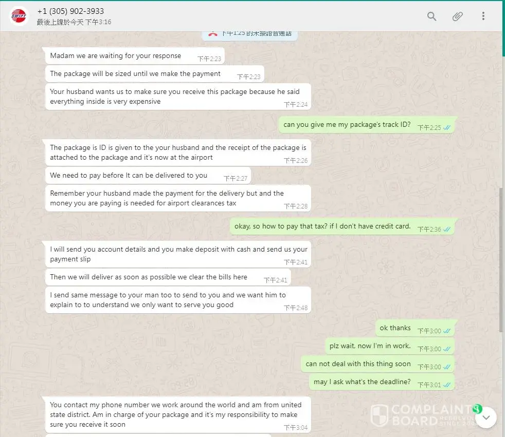 i been chating with this guy in fb so sweet n stuff bla, bla, and the we dating within weeks, he has 2 daughter, this seems unreal at first, and the he had surprise for me he said, his kids want to give me a surprise and want to send something for me..he send a airways bills to me and aspect me to receive the gifts in 3 days..i have so much faith in him one day the parcel surpose to arrive..an agent calling says a had to pay an extra rm3500 cause my parcel is overweight..and i told him that..he wish for me pay it first and than he told he had also send a bills in envelops inside and to tell no one about it even to the agent..so i say what?i had fight with him cause didnt have the money and he tell that he can not do anything because he at the offshore(sea)..so i still belive in him i send the money..but deep down something was not right..and call me again that she scan and found the money in bag..so i have to pay again rm6500 to make certificate..what the hell? so i google about this courier and found this page, i had goosebump all over cause majority of the story is the same..so immediatly i block his fb delete all photo that i send to him..also block the agent number and left the massage i not going to take the parcel..send it back and tell the sender to pay for himself..watch out women out there..they are really good..