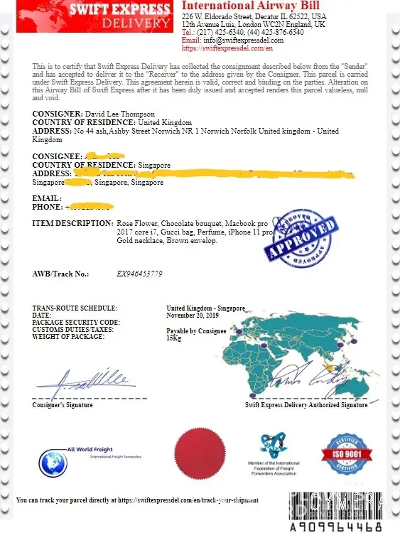 Well, the whole conversations are similar! OMG. How scary can this world be. He added me on Facebook with the intention to make friends. Then fell in love THAT EASILY. Thank goodness I am not that emotional naïve freak anymore LOL. Claimed to be a marine engineer and currently offshore in Mexico. Mentioned that he got a contract worth 20million USD so wanted to send gifts to me. Received a call from Malaysia saying that the parcel is transited there and I need to pay SGD2600? R you kidding me? This is the 1st time in my life to know that someone have to pay additional charges when someone sent u a parcel. And so I google on this SWIFT COURIER and came across this page. THANK YOU FOR SHARING!