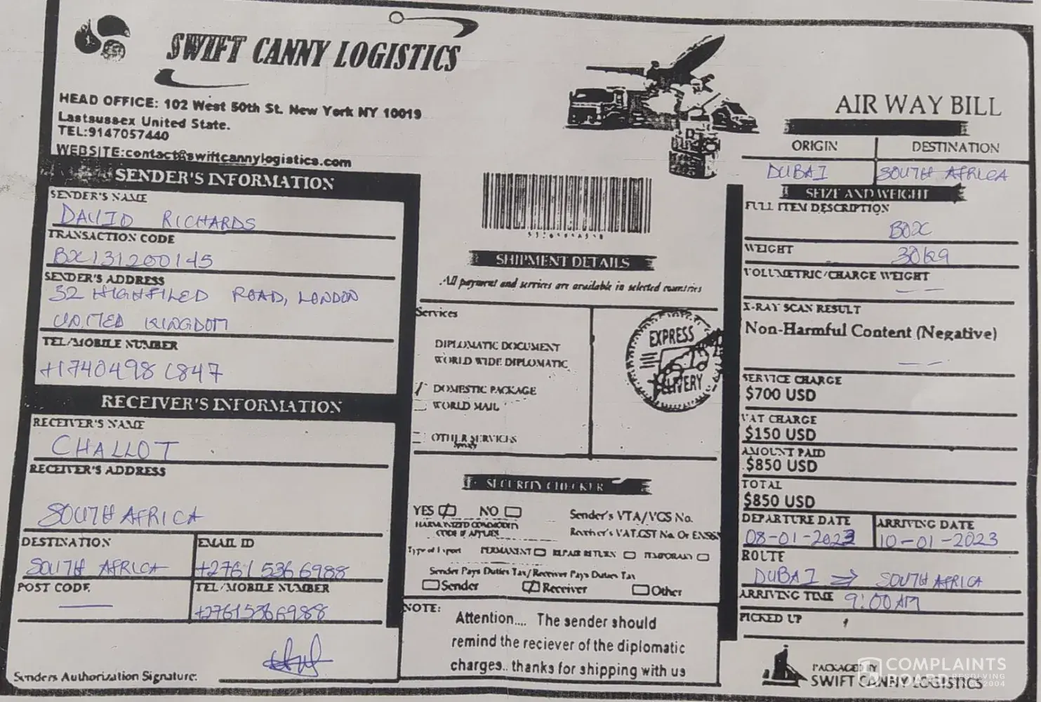 Someone named Harry Lee Chang (+[protected]) messaged me in IG and said that he wants to know me better and chat in whatsapp instead. We continue talking in whatsapp and he always greets me good morning with flowery words/quotes. Then he told me that he has a son and his prev wife died in an accident. His family is in Thailand and he was working in Greece(currently in contract in Oman). Then one day he asked me to pray for him so he can get the contract in Oman. And so he did. He accepted and to celebrate it he told me he bought a dior bag. I told him that I will accept it in person since I already have doubts on him but he insisted to deliver it via air freight (https://www.swiftdoorcourierxpress.com/trackingshippment/index.php). I said im not gonna give my details but he kept on asking me with his flowery words. I gave a general address(no house number or anything). And it is currently in “the Philippines†for me to accept. Someone contacted me via whatsapp. Haha very weird since no one contacts you via an app for parcel here the country. They said they are an agent and asking me 35,000 pesos($626) for the clearance of the parcel. I told them that im not gonna spend some money just for the package that was forcefully made me accept. Here are the details and chat from them lol