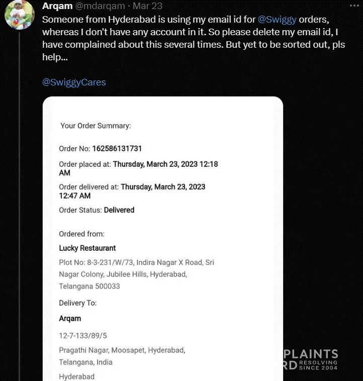 I have attached a picture of user complaining on twitter exactly same issue on 23 mar 2023 as mine, but swigy didnt do anything even after several complaints! If swigy fixed issue in january as per their resolution how did issue occur again in march 2023.