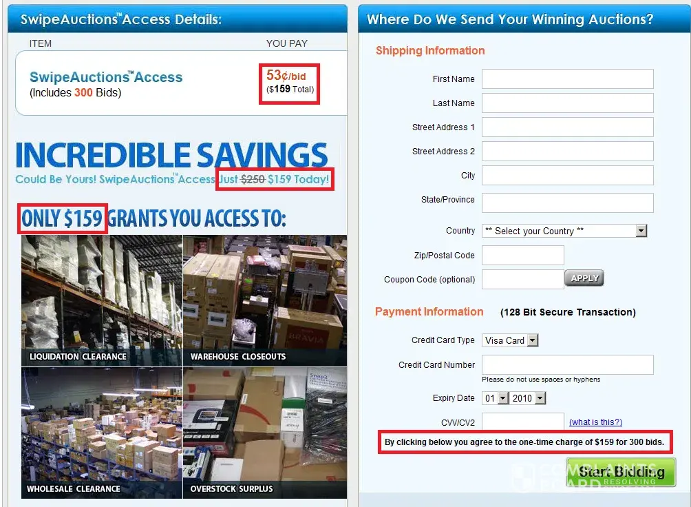 Initially they will advertise as internet auction website similar to e-bay. To verify membership they will ask for credit card and other personal information. Once provided with the info - they will automatically charge $159.00