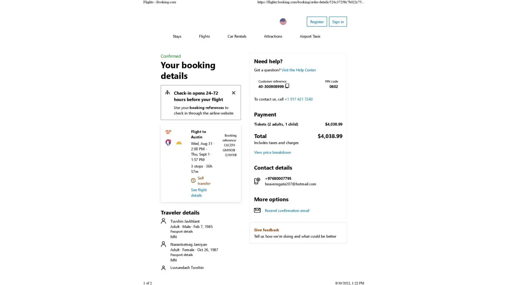 1. I, Tuvshin Javkhlant, booked and paid for plane tickets to travel from Ulaanbaatar, Mongolia to Austin, Texas, United States. In order to reach our final destination, we had to fly via Incheon, South Korea, Hawaii and Las Vegas. The travelers included myself, my wife, Ms. Narantsetseg Jamiyan, and our four-year old son, Luvsandash Tuvshin. We are citizens of Mongolia.