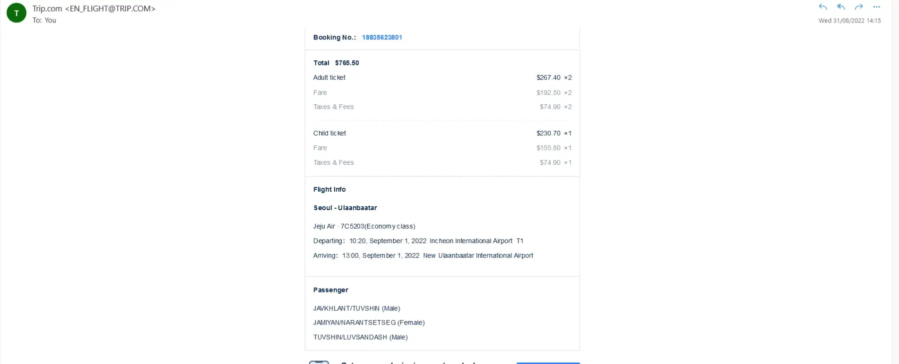 Plane tickets from South Korea to Ulaanbaatar, Mongolia - 2 adults and 1 child - $765.50