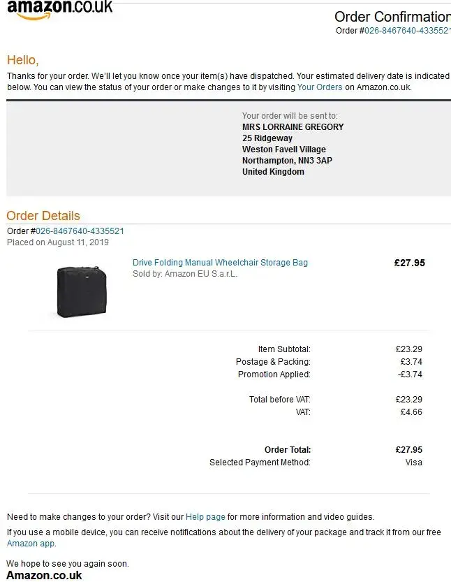 I have attached photos of damage done to the bag and wheelchair, details of purchase from Mobility and Lifestyle, also details for purchase of wheelchair bag.