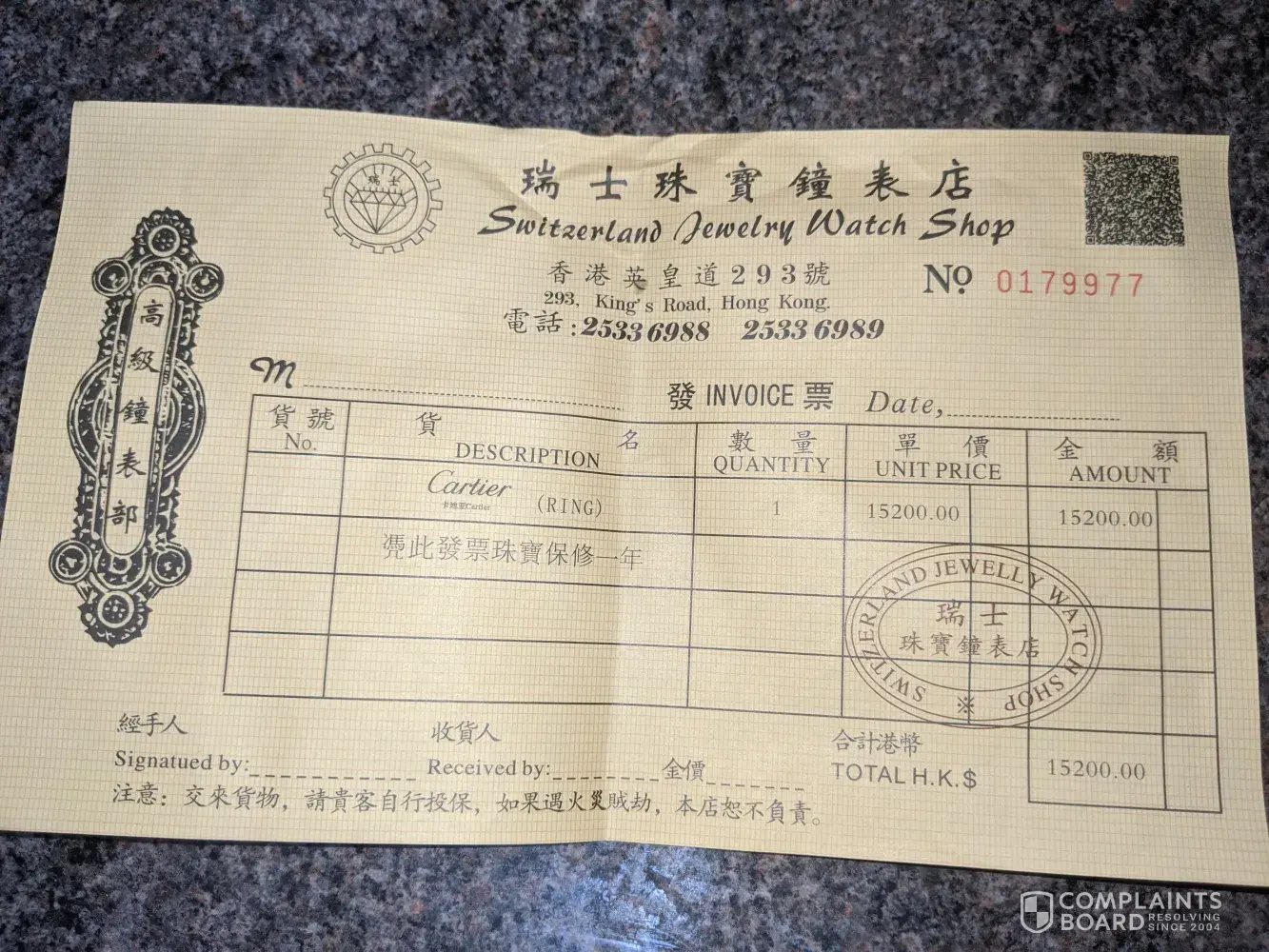 Received a ring I did not order. Invoice number 0179977. Address 293 Kings Road Hong Kong. Price 15200 Switzerland Jewelry Watch Shop