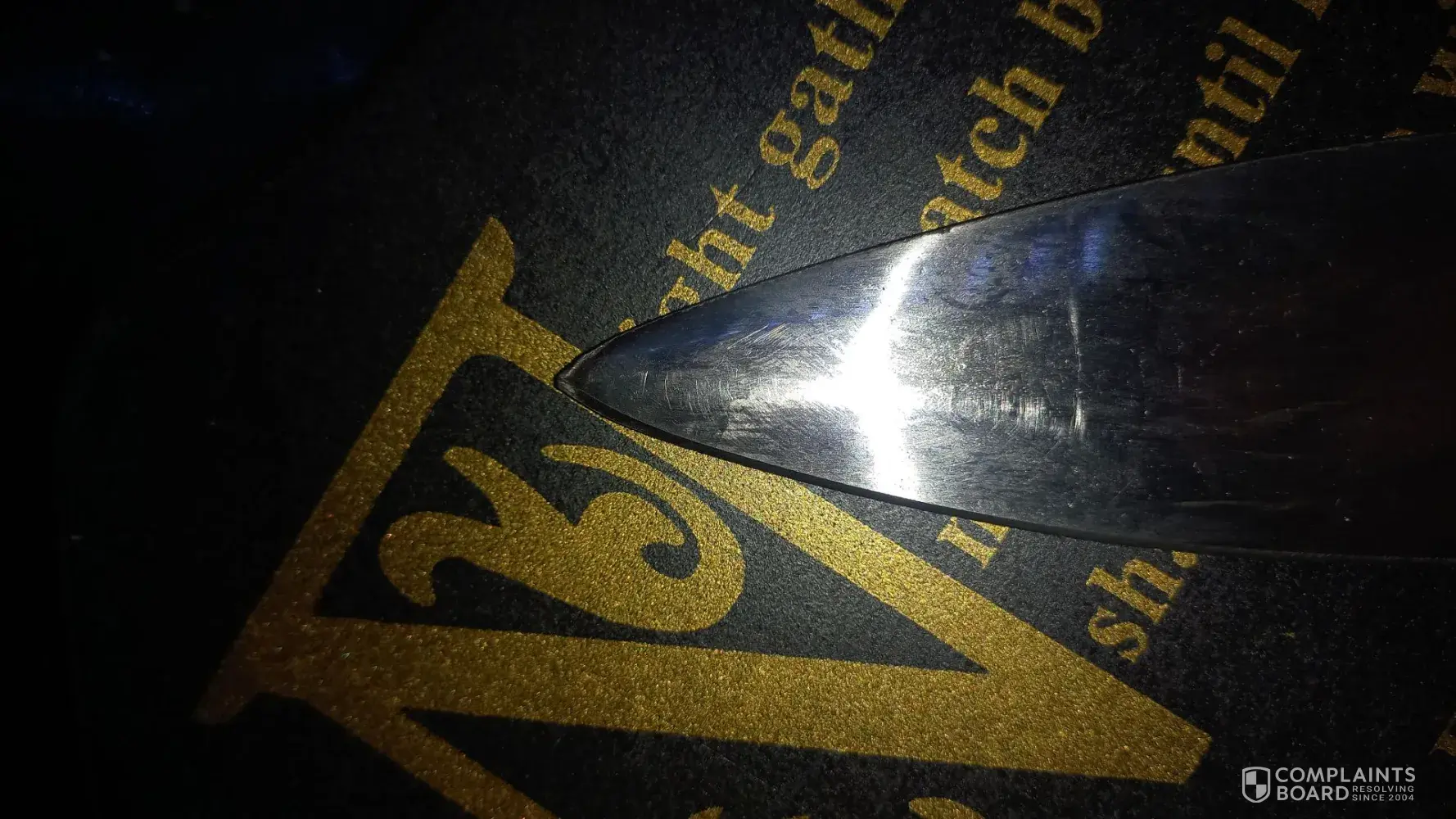 First the blade looks like a grinder was taken to it to make it sharp, the tip has been bent over on the edge to the point/ looks burnt aswell. The leather grip has been rubbed away in some parts and has lost the main outer shine to it, also not even flat in aome parts. Lastly the pommel, well... its been done with spary paint, then added a felt tip to make the lines, no joke felt tip pen... easy to see as it started to run out of ink, also last but not least the top has lost all paint and exposing the metal colour under it as it has rubbed off in the box.