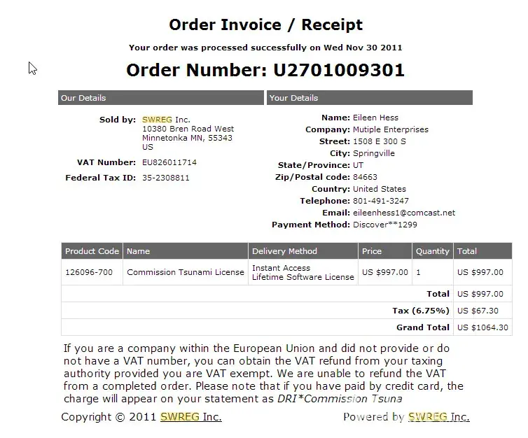 I asked them for their number.(SWREG) They don't have a direct line. They don't seem to have a direct anything. Christ! Either way, you get an email confirmation number and your money back.