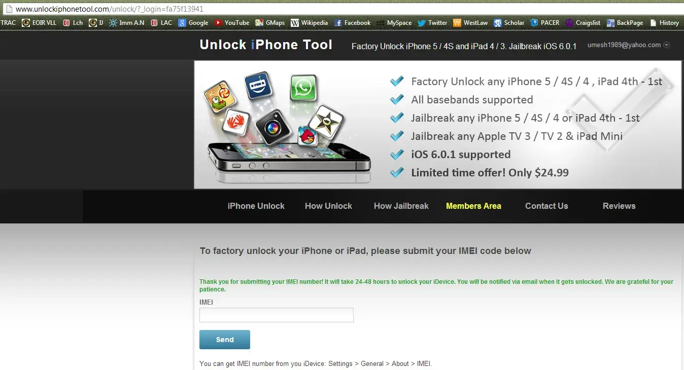 Once I logged in and went to the member area hoping for instructions to unlock my iPhone (or to access relevant downloadable software to unlock my phone), there was a textbox where I had to enter my iPhone's 15-digit IMEI number. When I entered that #, it gave me a message instructing me to wait for 24 to 48 hours, that they would unlock my phone. Here was the exact message the "scam website" gave me: