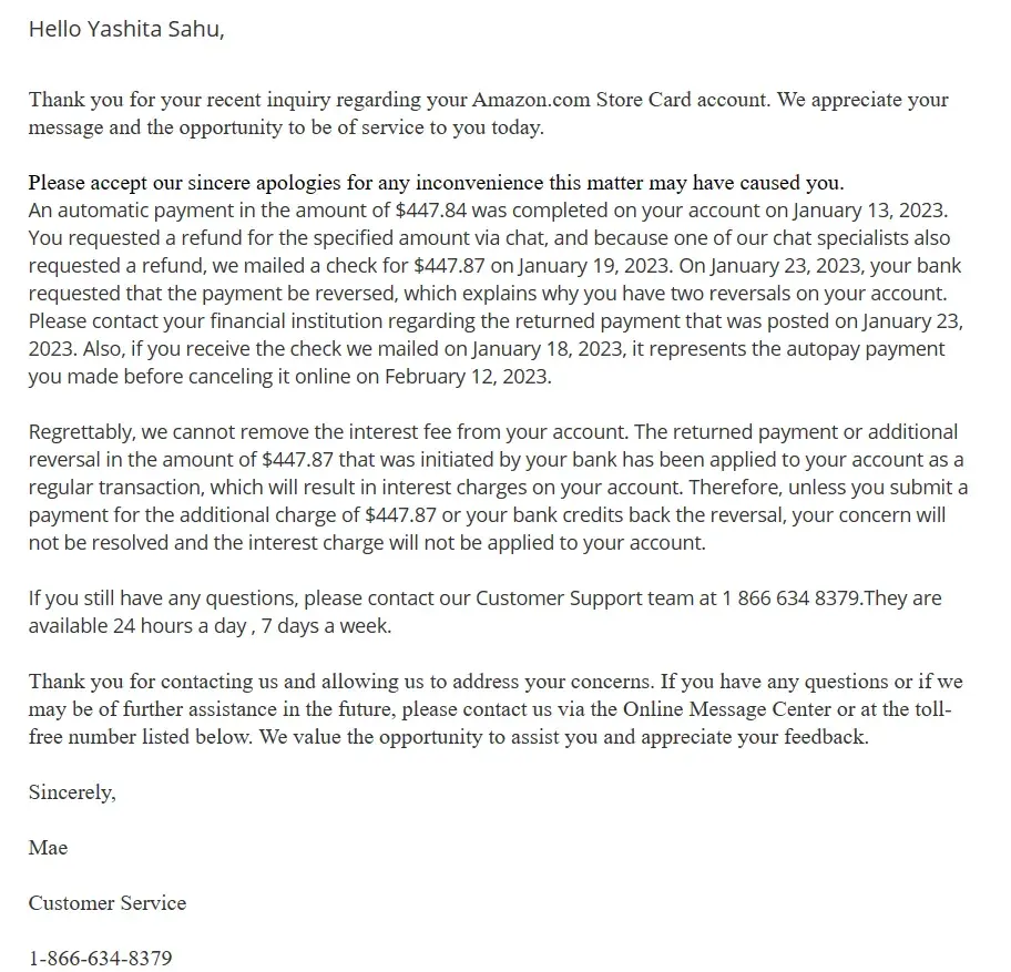 My payment was deducted from my bank acount twice in December. I was supposed to receive a refund. When it had not arrived 30 days later, I called yo check the status of my refund. I was told it must be lost in the mail. A check was reissued. When i deposited that check, Synchrony had stopped payment on it. 3 phone calls and 3 hours later, supposedly another check is on the way. On my 4th call, I was told by a VERY curt supervisor that I had asked Synchrony to stop payment on the check? For all of my hassle, stop payment fee from my bank, and the fact that they double deducted and held on to my money for 3 months, I received a 10.00 credit. Insulting. Will be closing this laughable account as soon as I receive my refund in excess of $2000. Naturally I will wait until it clears the bank. Unbelievable.