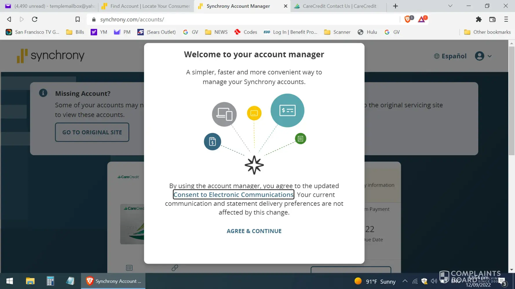 Logging in to my Care Credit account with Synchrony Bank, in August 2022, I was met with a pop-up forcing me to agree to electronic communications to access my online account. No X to close the box, and no decline option.