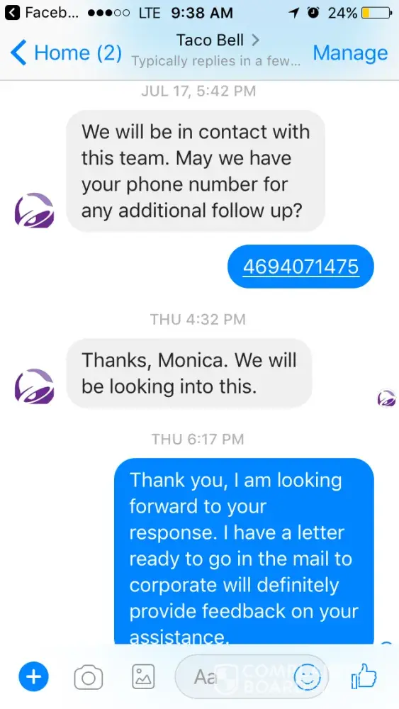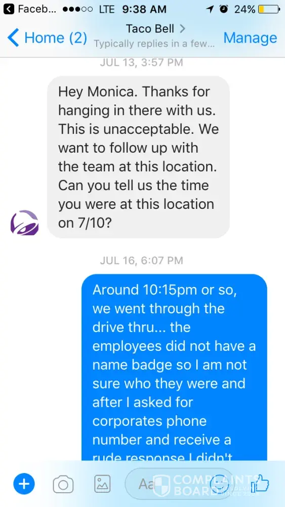 My husband and I go into Taco Bell to eat at approx 5:00 and we stand in line forever to order then I go sit down while my husband stands up there with 6 other people waiting for our food. We wait for 30 minutes and then get our food and his chicken quesadilla has nothin on it just sauce! The guy that was behind us for his money back and left and I have pictures of all this. The owner needs to go to Manchester Ky and find out how a Taco Bell does there because their food is awesome compared to Barbourville, Corbin, London and I am not joking. I eat at everyone of them and Barbourville is definitely the worse. This is bad management service and bad management skills. Their manager should be fired for this. They stood there taking care of drive thru while we stood there for 30 minutes. Then drive thru people started coming in with their food not right. Something needs to be done with all of these restaurants and Taco Bell isn't the only one! This [censor] is old and we pay [censor] loads of money for this food and it sure looks like slop compared to the pictures!