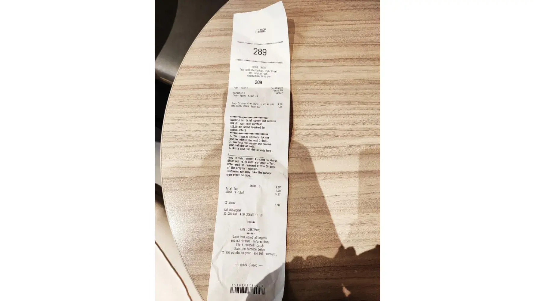 Hi, I been to Taco bell in Cheltenham, UK post code- GL50 3HH on 30/08/23