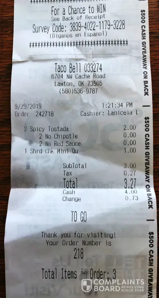 Read full complaintbad food - I got sick on your beef crunchy tacos. still sick 2 days later.