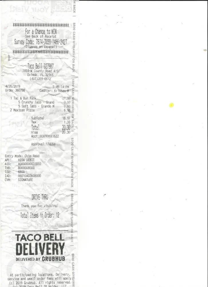 and a couple of other things we also ordered Senior Drinks. We were charged $1.29 for each Ld Nac Taco. MY Order no.107, time 10:41;35AM, Cashier Sarah H