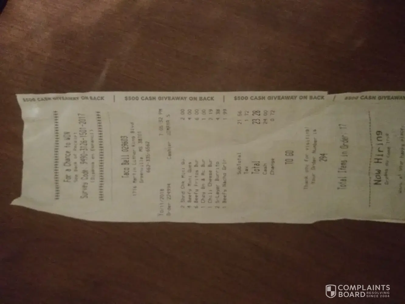 My husband and i went to taco bell on 10/11/2018 in Greenville Ms order # 029603 @ 7:05pm.