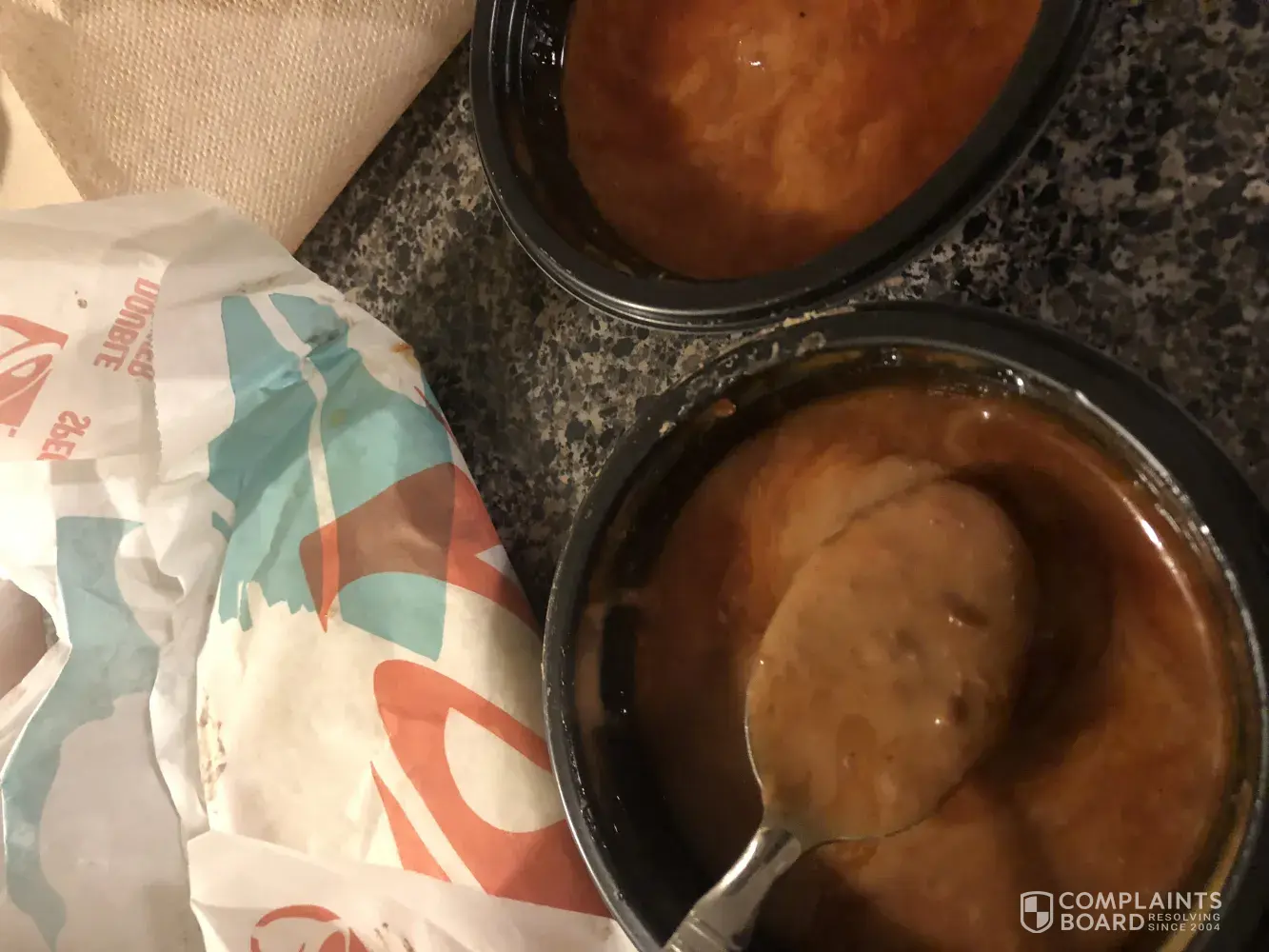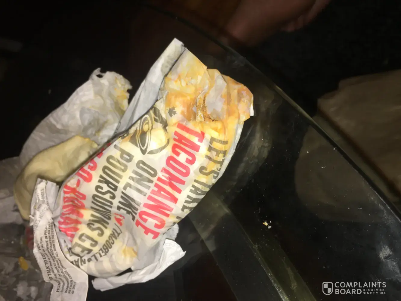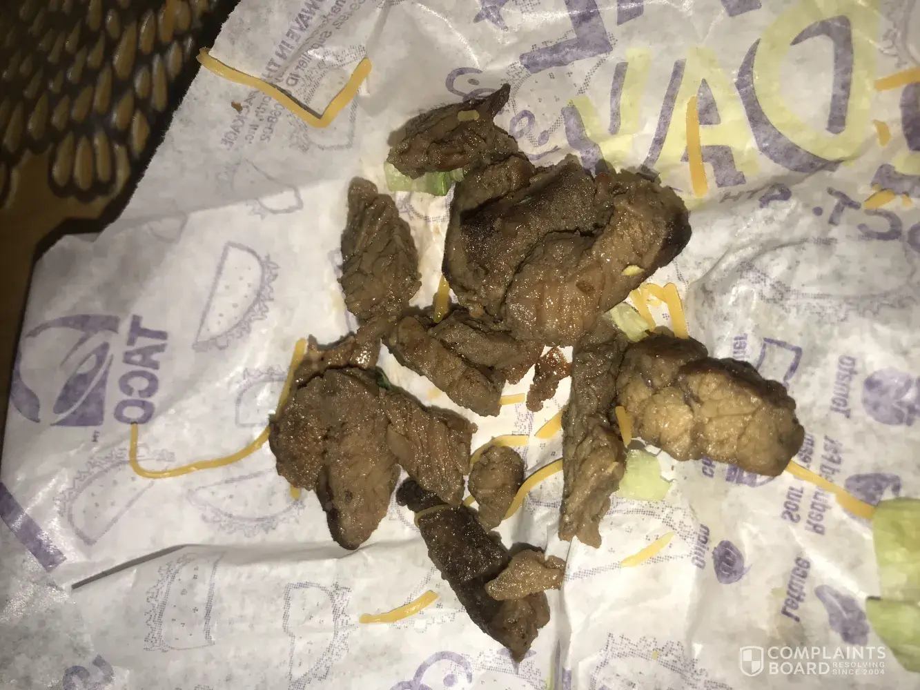 I went through the drive thru and ordered 2 shredded chicken hard shell tacos as I normally do. They're usually delicious and the chicken is always great. However, I went through the drivethru tonight and have no idea what in the world I received. First of all, as soon as I opened the first taco the smell coming out of it was HORRIBLE. I immediately knew something was not right... I didn't know what hit me. I opened the taco and saw BLACK chicken and pulled it out and this is what I got. Absolutely disgusting. In both tacos. I don't even know if this is chicken. I have never seen or smelled anything like it.