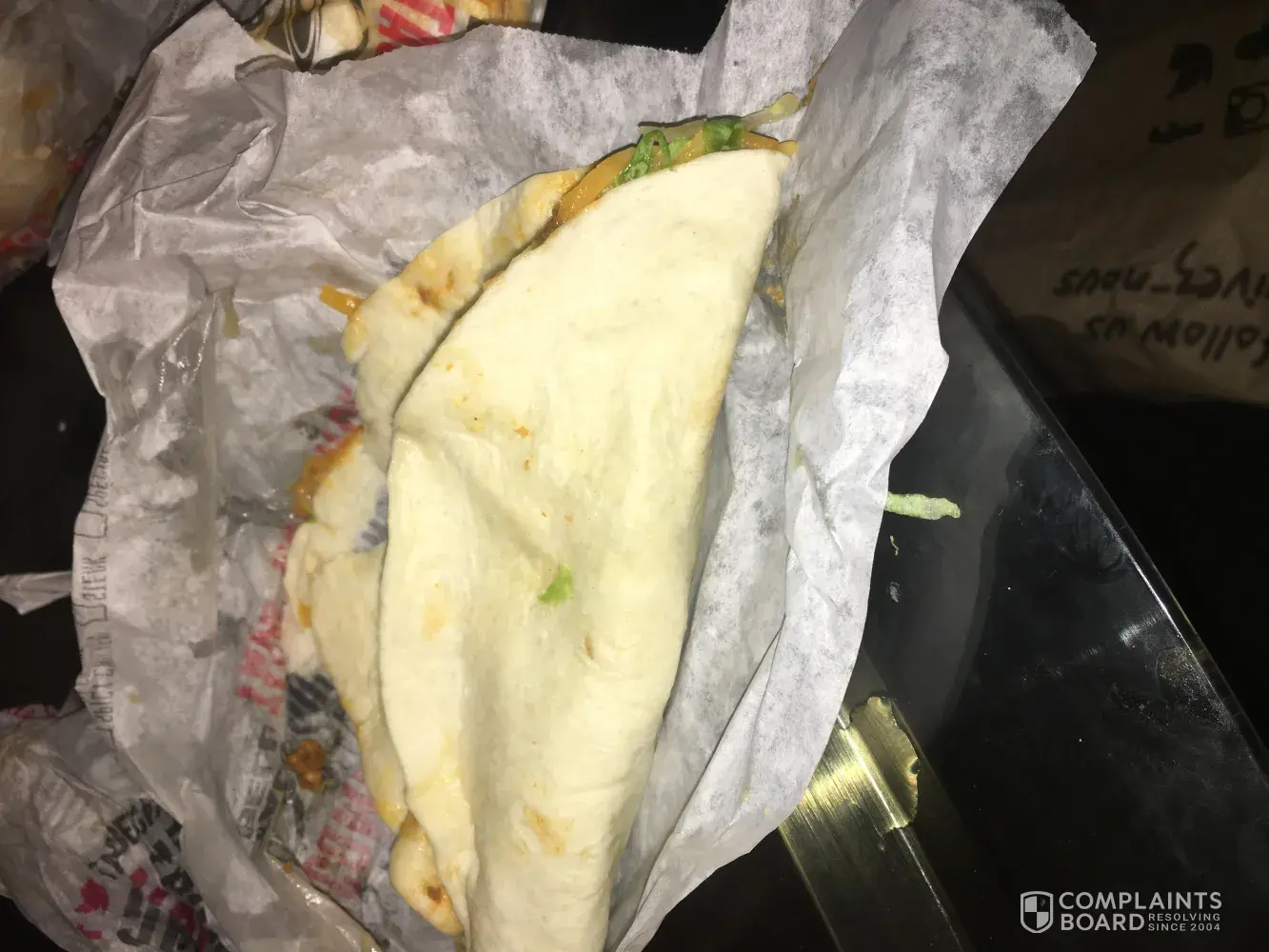 Picked up a mini beef quesadilla and a spicy tostada . Asked for no tomatoes because I am allergic . I got home and the quesadilla had CHICKEN inside .. which is totally bizarre and the tostada has tomatoes .. so I can't eat anything I ordered . Not too happy. It is too late to bring it back or else I would, I work in costumer service and I understand mistakes happen but ck in a mini beef quesadilla ? Just feel like no one cared at all