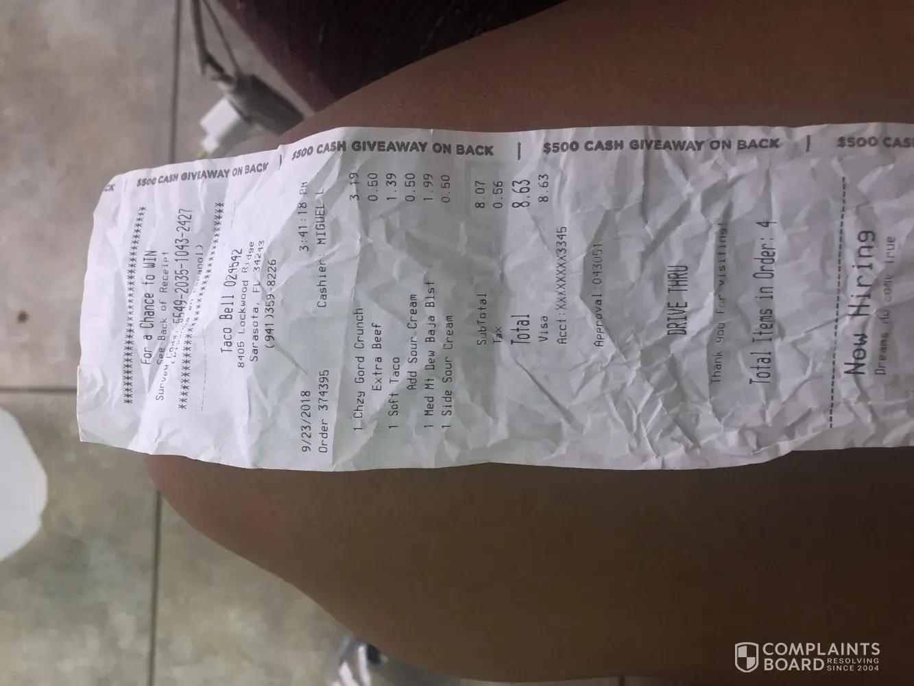 Went to Taco Bell on Lockwood ridge In Sarasota FL I asked for a double stuff cheesey Gordita crunch comb and was told they didn't have it but could make it and ring it up. I told them Nevermind just give me a 7 with a Baja blast and just the cheesy Being that worked at Taco Bell I know what they could've done. So when I get to the window after waiting about 8 mins I didn't have no quesadilla then was told I'd have to pay an extra 5 dollars for their mistake