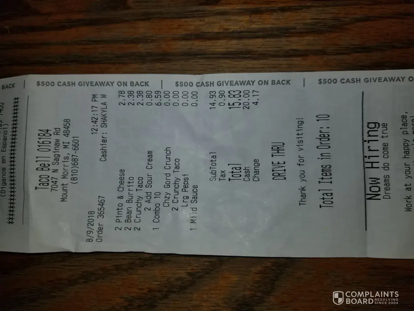 So I went to but at Taco Bell cause I was hungry so I order two things and the total was 7 something so I took out my 20 dollar bill and gave it to the cashier she gave me 3 dollars back when I gave her a 20 and my change was supposed to be 12 dollars so then she called this other person and she said I only gave her 10 dollars when I took out 20 dammm dollars out my purse so she didn't give me my food back or my money