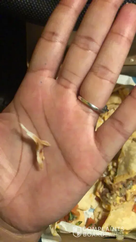 I went to Taco Bell and ordered nachos. About half way through, I pulled plastic out my mouth and I started looking through the box, and found more plastic. I then returned it to Taco Bell and the woman Veronica at the drive through called me a liar. When I pulled up and showed them, no apology but laughter. I am six months pregnant, who knows what would've happened had I injested it.