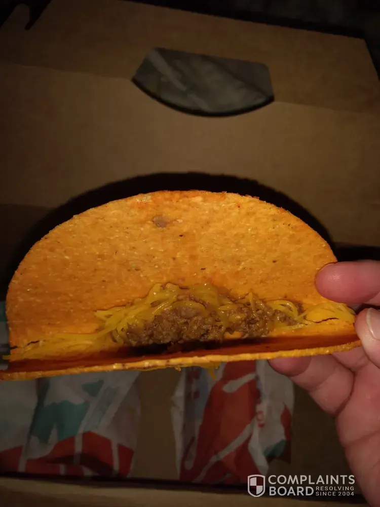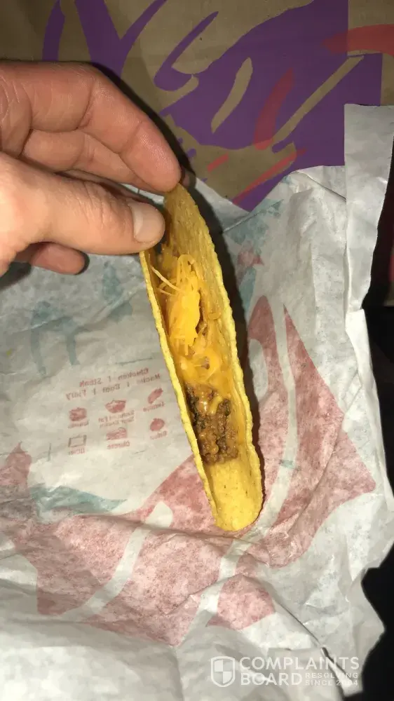 I know it's just a beef taco and really cheap but as you see in the photo... didn't know that cheap. Like really? It was all shell fam.. I'm mind blown how someone thought this was a solid taco job.. on another note, I ordered online so I could just go to the store and pick it up.. but they don't start making your meal you put in until you get there and tell them your name.. what the heck is the point of ordering online? I need this fixed ASAP