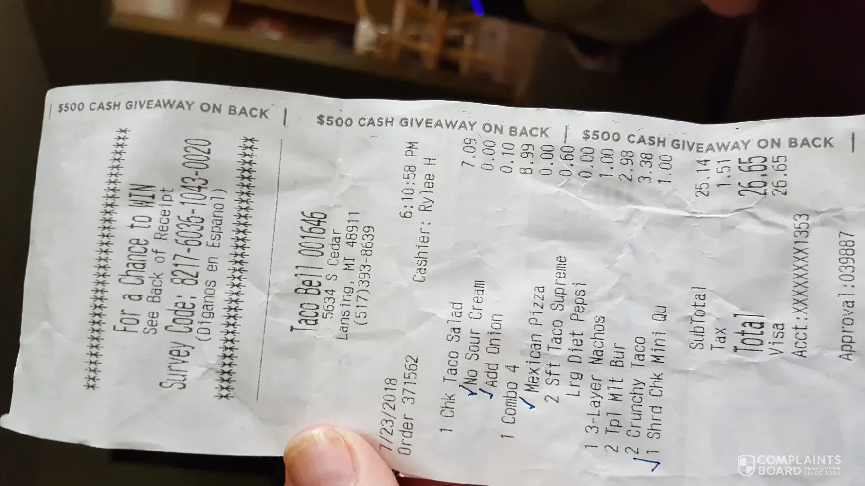 The reason I am complaining is that I have got food poisoning from the food consumed and needed hospitalization the next day. I have the statement of the purchase at taco bell in my bank statement.