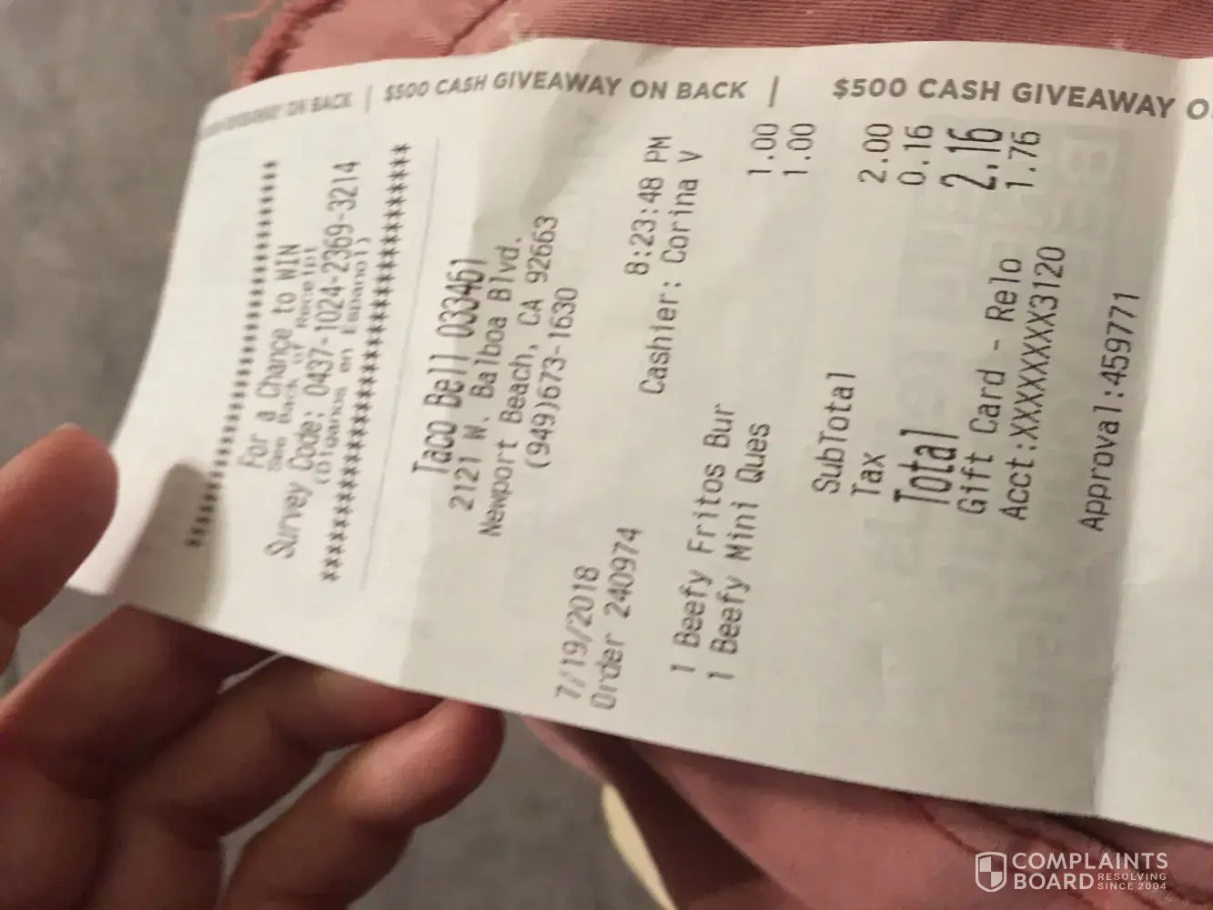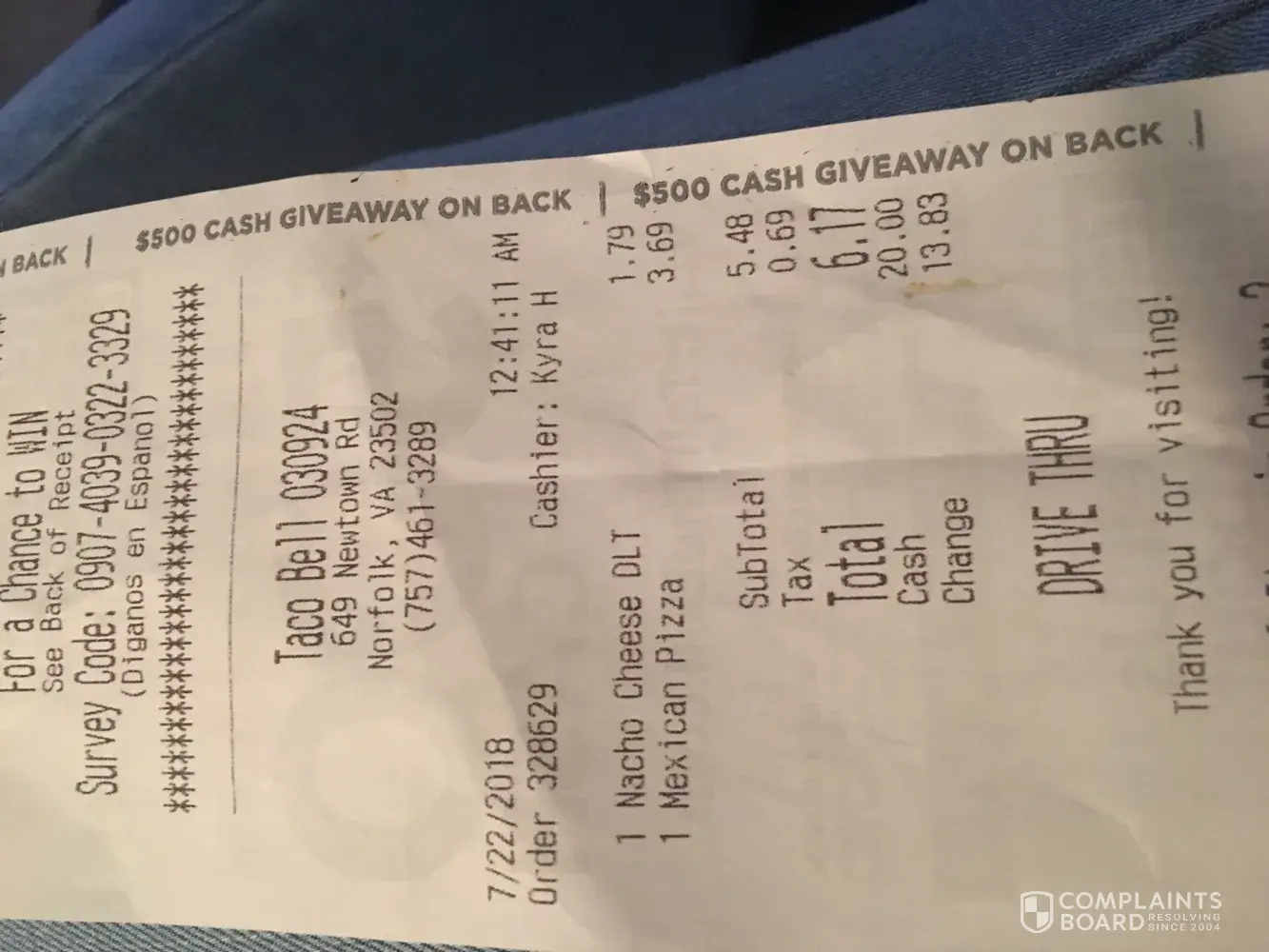 Hello there my name is jessica from Oceanside, San Diego. I'm writing a complaint about the Taco Bell that was opened up near me off Hacienda Dr. The first time I went, I wasn't even given half of my food, and the second time the cashier and manager didn't take my order at the speaker box so I had to re-order at the window but then they said they gave my food to the person in front of me, but they looked really high while laughing at me. My nacho fries were also tossed into my bag. I would recommend better management.