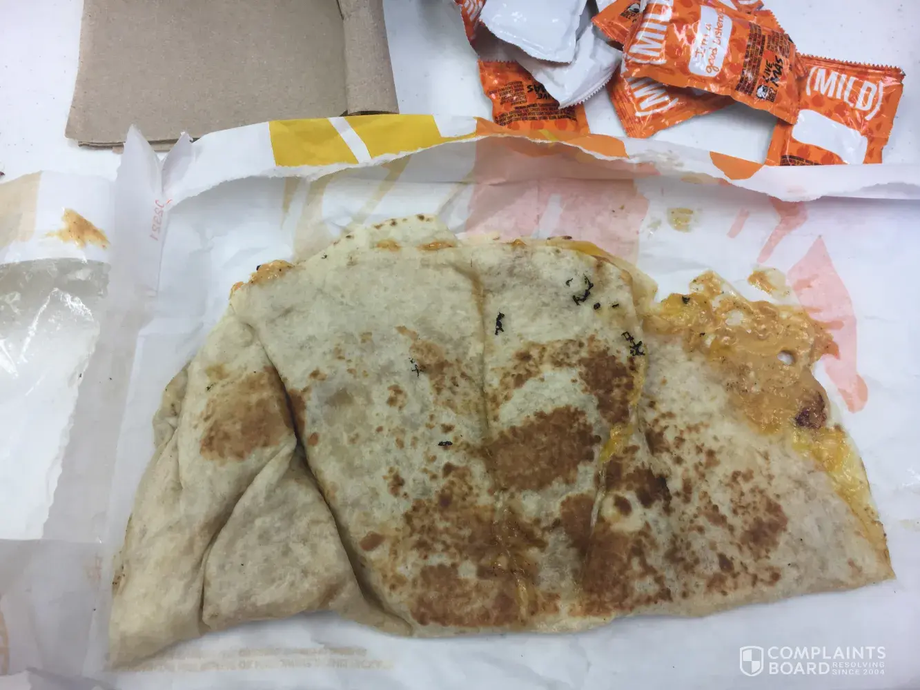 My quesadilla was smooshed and folded in a wad in the bottom of the bag, sauce was spewing out everywhere and there was hardly no chicken. Cheese fell out of my taco as soon as I tried to open it cause the wrapper was folded into the taco. And I emphasized no sour cream on cheesy fiesta potatoes and there was a huge blob of it right on top of them.
