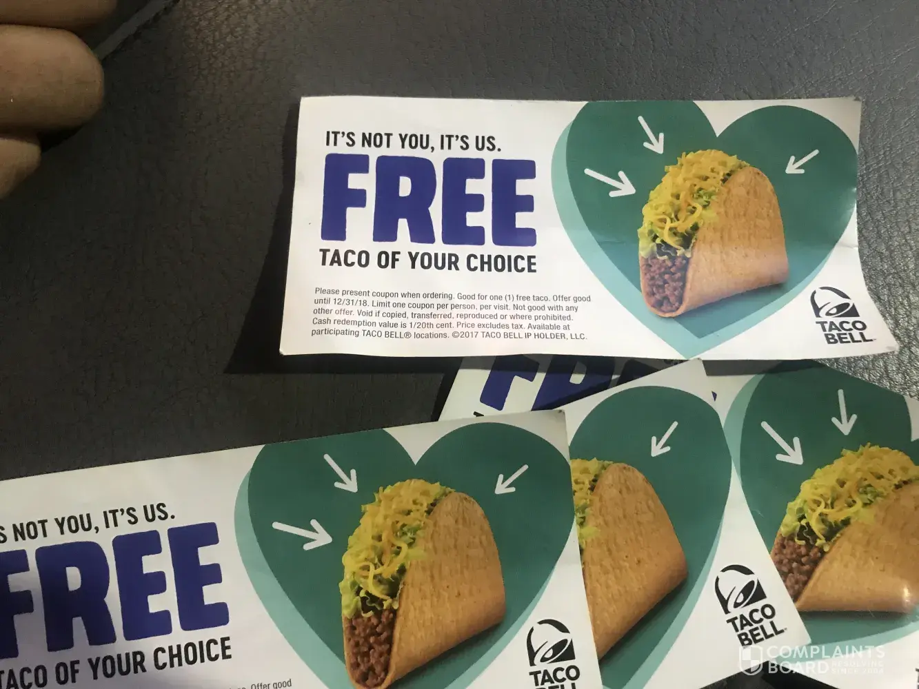 I went to a Taco Bell and waited over 30 mins for my food so they compisated me with 5 free tacos because we order over 10 tacos! Well I just tried to use all my coupons at the Taco Bell in rivergate and she refused to take the coupons saying I could only use one! So I said I will use them in all individual orders and she said no I could only use one point blank period! On the coupon it doesn't say on per day but does say it one per order which I was willing to do! If I couldn't use all of them at once he should've compisated me with something I could use all at once since I'm ordering food for my whole family and not just me.
