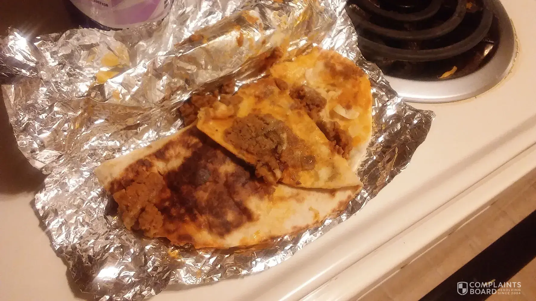 Had to throw my beefy mini quesadilla away. It was gross and sad... Half the tortilla was ripped back and meet everywhere... Wouldnt have fed it to my dog... And my 2 triple melt burritos were cold and filled with rice in the middle... My girlfriend could barely eat half of hers... I had a long day at work and this is unacceptable and inconsiderate... I want a refund... I can send pictures of the queadilla that went right in the trash... I was also not given a receipt... Convenient for such lazy and inconsiderate workers... But i ordered 2 triple melt burritos 2 beefy mini quesadillas and a nachos and cheese... The nachos were the only thing that didnt tastw bad, but were still cold... Unacceptable to take my money and give me inedible and gross food.