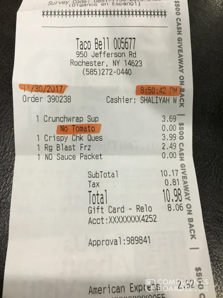 I visit Taco Bell locations pretty regularly (both at home and away at college) so this is a common request I make of the employees at Taco Bell. As shown in the photos I have submitted, I ordered no tomatoes and yet, when I began eating my food there were plenty of tomatoes on it. I assumed this was a simple request because of how accommodating the employees typically are when I ask this of them. Yet this is not the first time this has happened. I try not to be the person who complains very often but I felt like with such a simple request not being met, it should be called to attention. I visit this location frequently so I would like to be reimbursed for this crunch wrap (since the complaint form asks that you come up with a solution). Hopefully the employees can be spoken to and reminded to be careful of what ingredients go into each item based on what's requested. Thank you for your time.