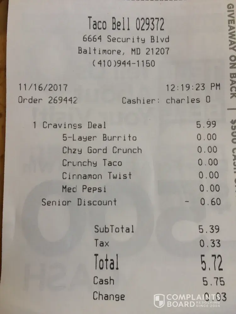 I would like to log a Consumer Compliant against Taco Bell 029372, 6664 Security Blvd, Baltimore, Maryland [protected]. On 16 November 2017!@12:19:23 PM I purchased the Craving Valued Meal advertised at $5.00, but was charged $5.99. The person that help me Charles O indicated to me that the Computer was providing a incorrect charge of $5.99, Knowing this I asked him was a planning on honoring the correct advertised price? He indicated to me that he would fix this later. okay, rather than fix the problem then he adjusted my sell to reflect a Senior Discount of $0.60. making my sale $5.39 Plus the taxes. My order was for the dining room and the whole time I was there transaction, after transaction was taken incorrectly. I explained the Mr. Charles O that I was a Weights and Measures Inspector and that practice was not correct and that prior to making any additional sales the advertised price would have to be provided to the consumer. After dining at 14:00 and when I was to leave the pricing had not been corrected. My order Number was 269442.